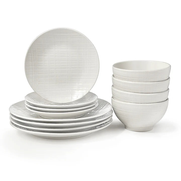 An exquisite crisscross of white on white brings an elegant, alluring pattern to this porcelain dinnerware set, making it a striking addition to any table. The perfect combination of modern and classic design, this dinnerware set will bring a touch of sophistication and glamour to your next gathering.