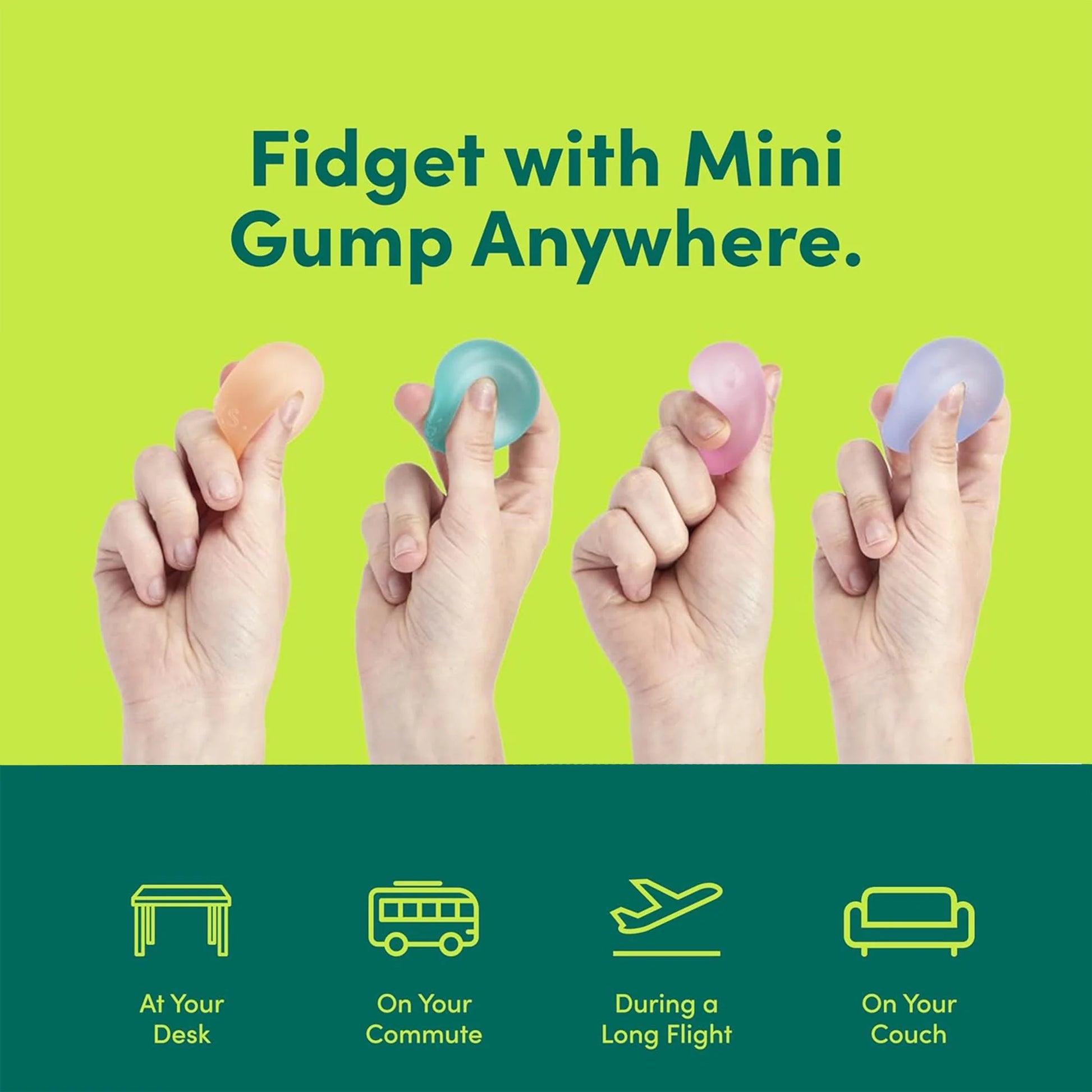 Love slime but hate the mess? Gump is for you! Filled with a pliable gel, Gump is the stress ball that always bounces back, keeping your mind clear and your hands clean. Available in 3 sizes and 7 translucent colors you can choose your favorite or collect them all. There's a Gump for every palm!